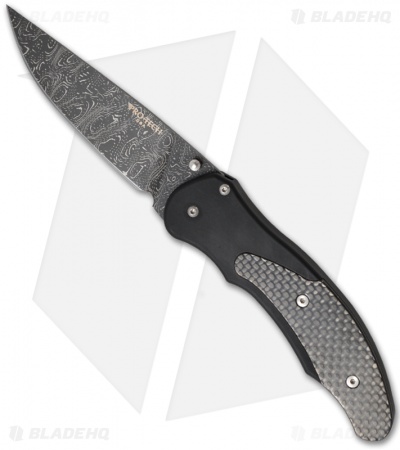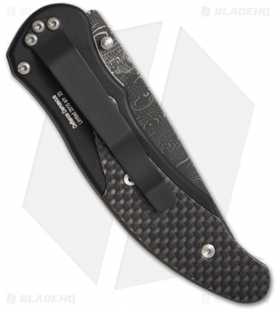 This Limited Edition Defiance features a Chad Nichols “Ladder Dot” Damascus steel blade. The body is black anodized T-6 6061 aluminum with polished carbon fiber inlays on the front and back of handle. The black finished pocket clip is tip-down for easy carry. Each knife is serial numbered on the back side of the handle.