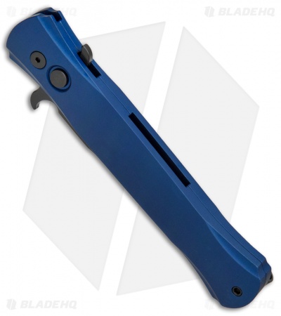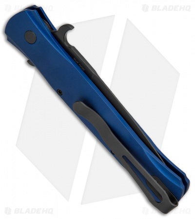 This Don knife features a solid, smooth blue anodized aluminum handle. The blade is black finished along with the deep carry pocket clip and hardware.