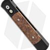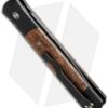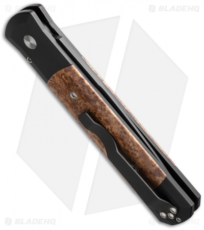 This Godfather knife has a black DLC finished 154-CM steel blade. The handle is black anodized aluminum with black ash burl wood inlays, satin finished hardware and a black tip-up carry pocket clip. Please Note: The color and grain of the wood will vary from knife to knife.