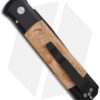 This Godfather knife has a black DLC finished 154-CM steel blade. The handle is black anodized aluminum with Maple Burl wood inlays, satin finished hardware and a black tip-up carry pocket clip. Please Note: The color and grain of the wood will vary from knife to knife.