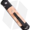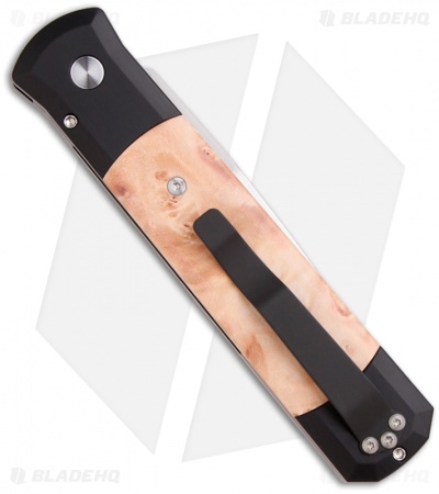 This Godfather knife has a satin finished 154-CM steel blade. The handle is black anodized aluminum with Maple Burl wood inlays, satin finished hardware and a black tip-up carry pocket clip. Please Note: The color and grain of the wood will vary from knife to knife.