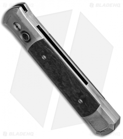 This custom Godfather knife features an orange peel finished titanium handle with marbled carbon fiber inlays and a satin titanium pocket clip. It has a matching carbon fiber push button insert and the hardware is satin finished. The blade is satin finished 154-CM steel.
