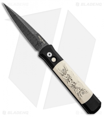 This custom Damascus Godfather knife features a Skull design by artist Linda Karst Stone. This Godfather exclusive has been recreated in “laser scrimshaw” on the front ivory Micarta inlay. The “Tuxedo” style handle features a black anodized aluminum frame with the Micarta scales and matching push button insert. The hardware is satin finished and the tip-up carry pocket clip is black. The blade is Chad Nichols Ladder pattern Damascus steel. This is a limited, numbered run of 40 knives.