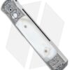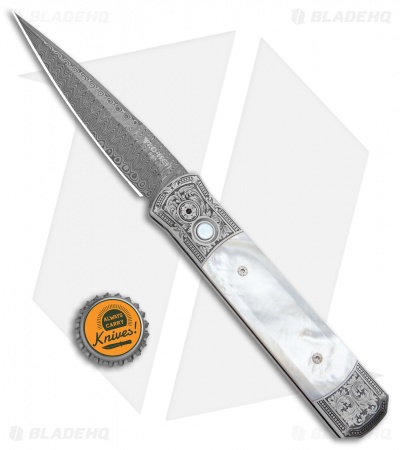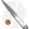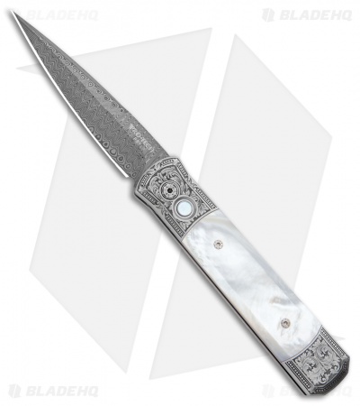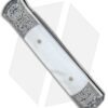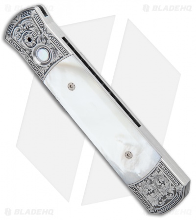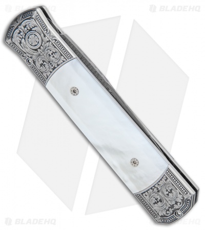 This Ultimate Custom Godfather is an impressive knife that is destined to be a prized collection piece. The frame is solid 416 steel with a beautiful hand satin finish and presentation grade mother of pearl inlays front and back. The handle has also been engraved by Bottega Incisioni C. Giovanelli. This Custom Godfather also features a stainless Damascus blade with a beautiful pattern.