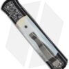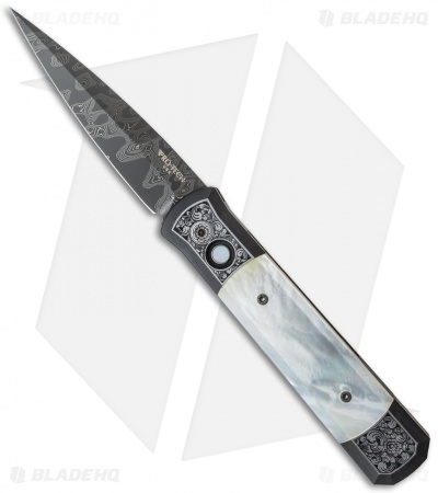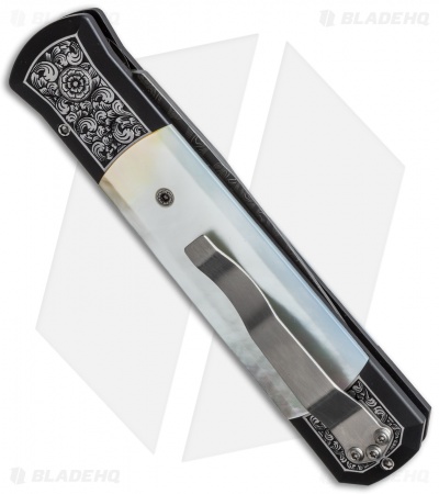 This custom Godfather knife has been given a lot of extra attention and is generously outfitted. It features a two-tone DLC black and hand satin finished 416 stainless steel frame with presentation grade mother of pearl inlays and a matching push button insert. The engraving on the handle, and even the body screws, is done by Bruce Shaw. The blade is Chad Nichols “Black Out” pattern stainless Damascus. The pictures above are of the actual knife for sale.