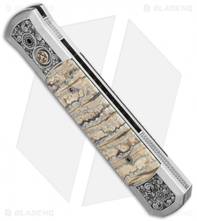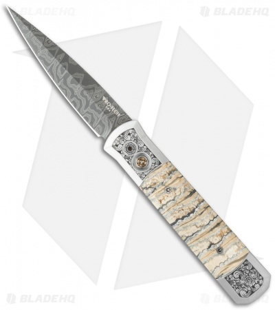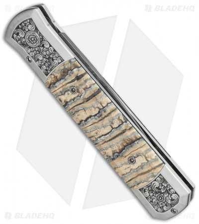 This custom Godfather knife ranks high in the custom Pro-Tech lineup. It features a hand satin finished 416 stainless steel frame with ancient Mastodon tooth inlays. The engraving on the handle is done by Bruce Shaw and even the body screws are custom engraved! A mosaic pin inlay decorates the firing button. The blade is Chad Nichols “Black Out” pattern stainless Damascus. The pictures above are of the actual knife for sale.