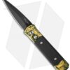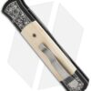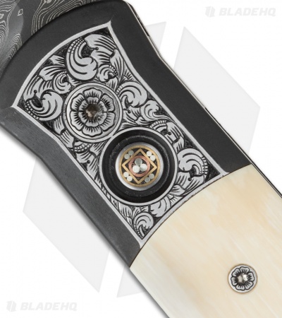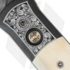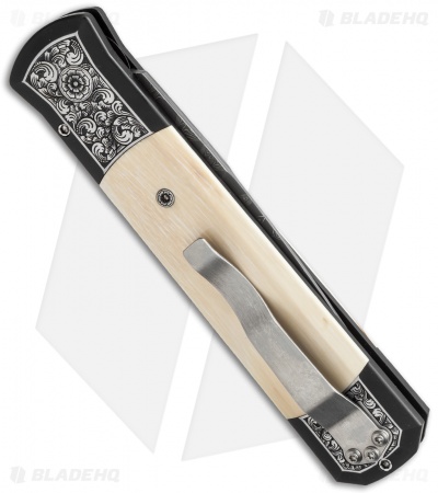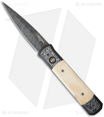 This custom Godfather knife ranks high in the custom Pro-Tech lineup. It features a two-tone DLC black and hand satin finished 416 stainless steel frame with ancient Mastodon inlays. The engraving on the handle is done by Bruce Shaw and even the body screws are custom engraved! A mosaic pin inlay decorates the firing button. The blade is Chad Nichols “Black Out” pattern stainless Damascus. The pictures above are of the actual knife for sale.