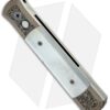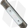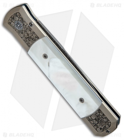 This Ultimate Custom Godfather is an impressive knife that is destined to be a prized collection piece. The frame is bronze anodized 6al4v titanium with a beautiful hand satin finish and mother of pearl inlays front and back. It features hand engraving by Master Engraver Bruce Shaw. The blade is stainless damascus steel hand forged by Chad Nichols. Includes a wooden display box.