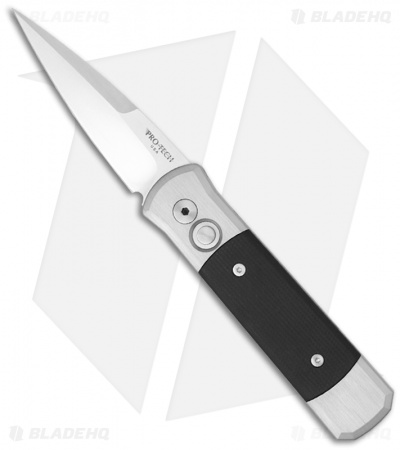 This Pro-Tech Godson automatic knife has a satin finished 154-CM steel blade and an aluminum handle with black G-10 inlays. Satin finished hardware and a secure black pocket clip complete the solid Pro-Tech design.