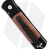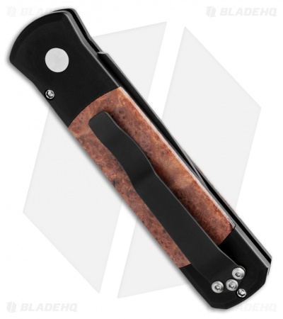 This Godson has a black DLC finished 154-CM steel blade with a plain edge. The handle is black anodized aluminum with Lace Redwood Burl wood inlays. Black finished TiNi tip-up pocket clip and satin hardware.
