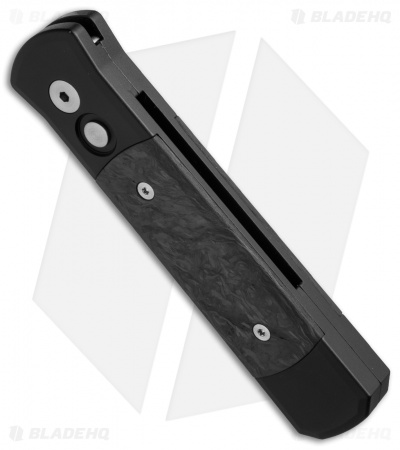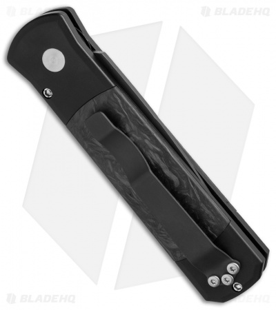 This Godson has a black finished 154-CM steel blade with a plain edge. The handle is black anodized aluminum with marbled carbon fiber inlays. Equipped with a black finished TiNi tip-up pocket clip and satin hardware.