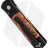 This Godson has a satin finished 154-CM steel blade with a plain edge. The handle is black anodized aluminum with Afzelia Lay Burl wood inlays. Satin finished hardware and black pocket clip.