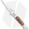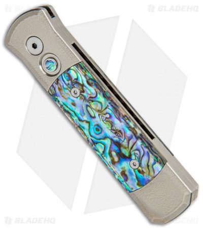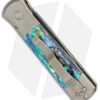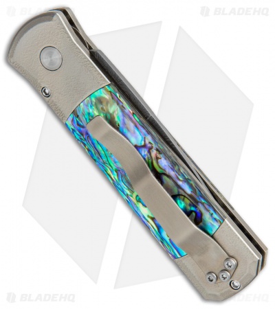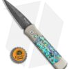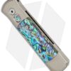 This Custom Godson has a Chad Nichols stainless Damascus blade and an orange peel textured titanium handle with abalone inlays. It comes outfitted with a matching abalone push button insert and a titanium pocket clip.