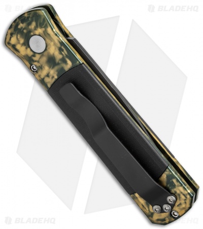 This limited edition Godson has a green & yellow Jazz anodized aluminum handle with black G-10 inlays and a black finished pocket clip. The blade is black DLC finished 154-CM steel with a plain edge.