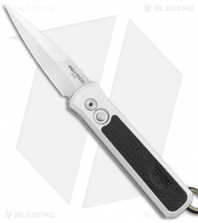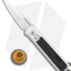 This Godson is a collaboration between Pro-Tech and Greg Stevens Design. It has a silver (clear) anodized aluminum handle with a satin, CPM-154 blade and satin hardware. The handle has a black, vintage, Swiss leather inlay and lanyard. The piece is completed with a small, silver, deep-carry pocket clip.