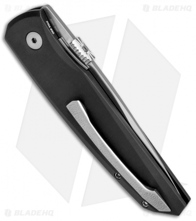 This Pro-Tech is a modern update to the classic Harkins ATAC D/A automatic knife. It is outfitted with a black anodized handle, carbon fiber inlays, a custom thumb plate opener, and a stonewashed blade. The hidden automatic release is located under the topmost inlay for covert opening action. One impressive update you’ll notice instantly is the precision milled titanium pocket clip.
