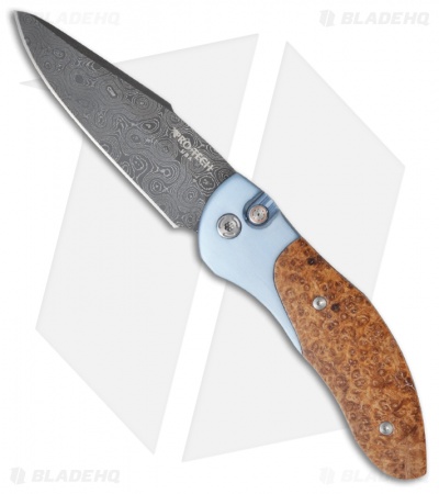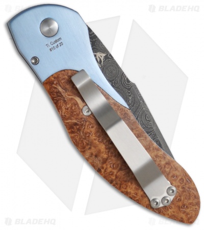This 2011 Custom Titanium Doru knife is a Limited Edition model, with just 20 being made. It features a beautiful hand satin finished blue 6Al4V titanium frame with black Ash burl wood inserts. The firing button has a mosaic insert and the pocket clip is satin finished. The Chad Nichols Damascus stainless steel blade has the Elishewitz Design logo on back. The handle is marked with the serial number on back below the pivot pin, “#5 of 20”.