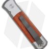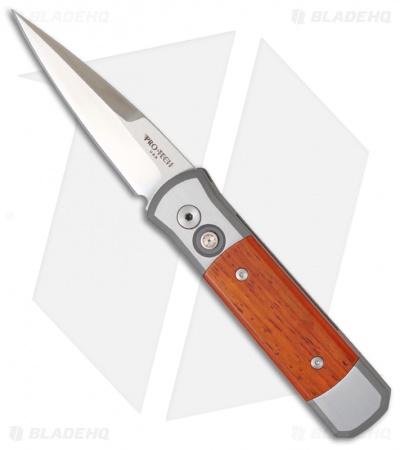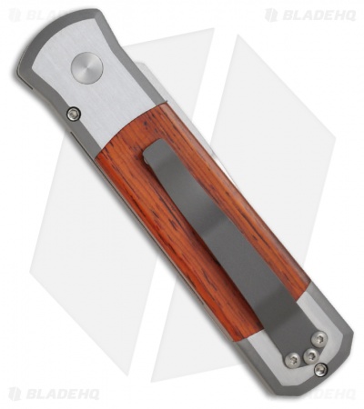This Steel Custom Pro-Tech Godson knife is a great collection piece. It features a 416 stainless steel handle frame with a two-tone finish; satin faces and bead blasted edges. The handle has beautiful Cocobolo wood inlays front and back. Firing button with mosaic insert and bead blasted titanium pocket clip. The satin finished blade is 154-CM stainless steel.