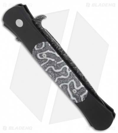 This Large Don knife features a Chad Nichols high carbon Damascus steel blade. The body is 3D machined 6061-T6 aluminum; nearly every surface of the Don is curved including the front. This Don has natural brain coral inlays on the front and back of the handle. The hardware on this knife is all satin finished. This knife is incredibly light despite it length.