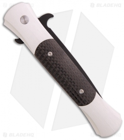 The Large Don features a DLC black finished 154-CM blade (plain). The body is 3D machined T6 silver aluminum – nearly every surface of The Don is curved including the front. The Don has carbon fiber inlays on both the front and back of the handle. The hardware on this knife is all satin finished. This knife, despite it’s length is incredibly light. For a size comparison between the Don and the Large Don see picture #3.