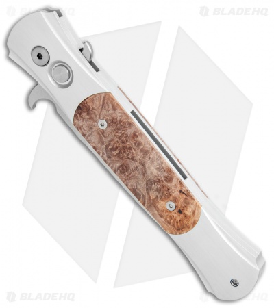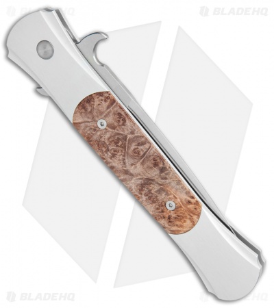 The Large Don features a satin finished 154-CM blade (plain). The body is 3D machined T6 silver aluminum- nearly every surface of The Don is curved including the front. The Don has maple wood scales on both the front and back of the handle. The hardware on this knife is all satin finished.