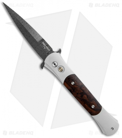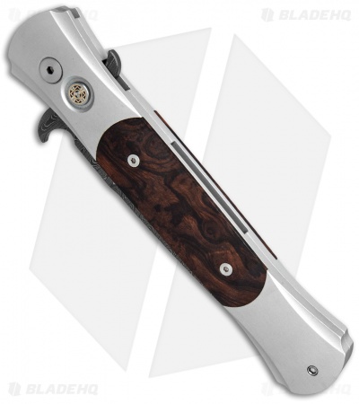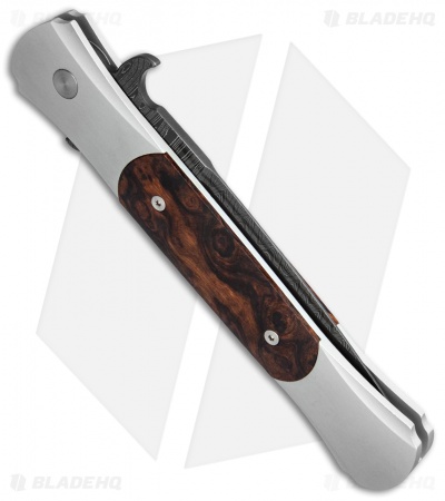 This Custom Large Don features a hand finished steel frame with jewelry grade desert ironwood inlays. The slender spear point blade is made from Chad Nichols damascus stainless steel. A decorative mosaic pin push button gives this beautiful collector’s piece an elegant look.