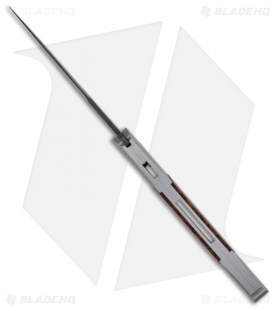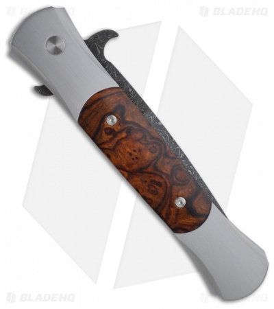 This Large Don features a hand satin finished steel frame with presentation grade Desert Ironwood scales on both the front and back of the handle. The blade is Chad Nichols Damascus. The mosaic push button fits well with this beautiful knife. The hardware is satin finished.