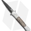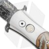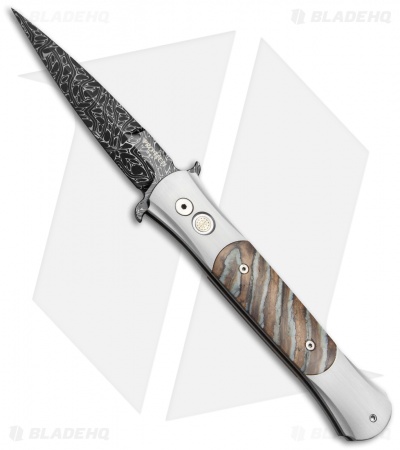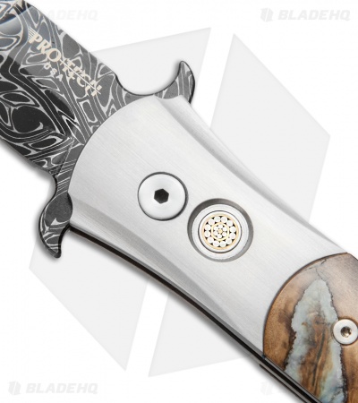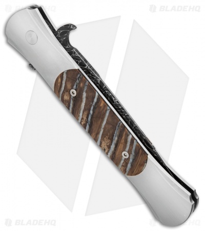 This Large Don knife features a hand satin finished 416 steel frame with Ancient Mastodon Tooth inlays on both the front and back of the handle. The blade is Chad Nichols mosaic high carbon steel Damascus. The push button has a mosaic insert that fits great with this beautiful knife.