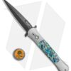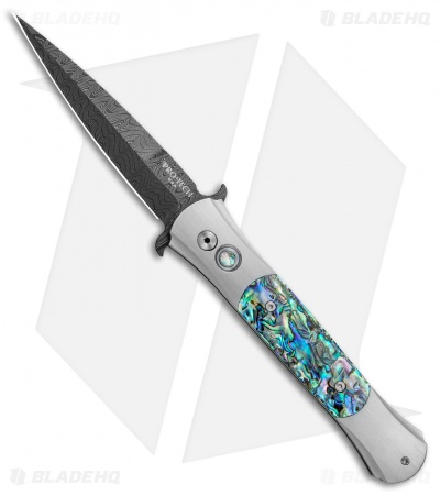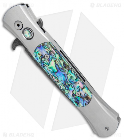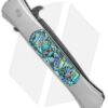 This Large Don knife features a hand satin finished 416 steel frame with Mosaic Abalone inlays on both the front and back of the handle. The push button also has a matching Abalone inlay. The blade is Chad Nichols Damascus stainless steel.