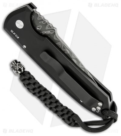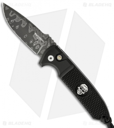 This Les George designed Rockeye from Pro-Tech knives features a Chad Nichols Damascus steel blade. The handle has been outfitted with the Bruce Shaw sterling silver skull and a black lip pearl push button insert. Custom skull lanyard. This is a limited run of just 35 numbered knives!