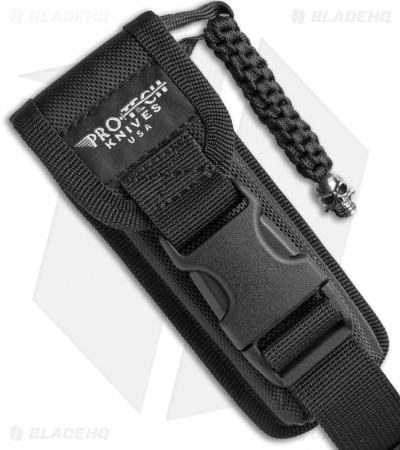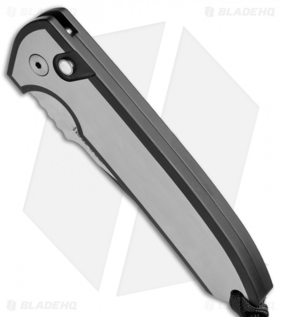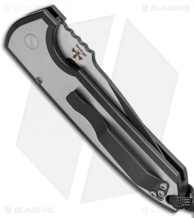 The Steel Custom Rockeye, with its 416 stainless steel handle, has a significant amount of heft. This automatic knife has a smooth contoured surface with a two-tone satin and black DLC finish. The blade is also two-tone finished with black grinds and satin flats. Action is strong and engaged by the push of the pearl push button. The Rockeye is outfitted with a custom skull bead lanyard. This is a numbered run of 50 knives.
