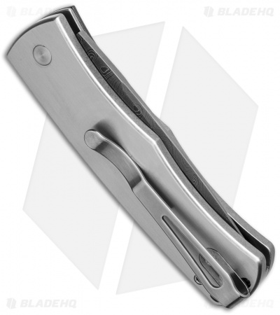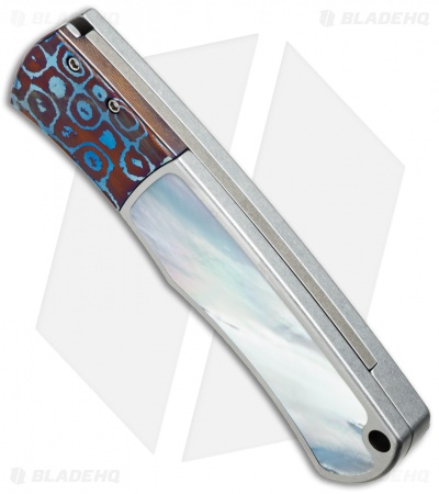 This custom Magic BR-1 knife from Pro-Tech is sure to impress. It has a Chad Nichols stainless Damascus steel blade and two-tone satin/stonewash finished 416 stainless steel handle with a mother of pearl inlay and a Moku-Ti bolster.