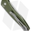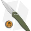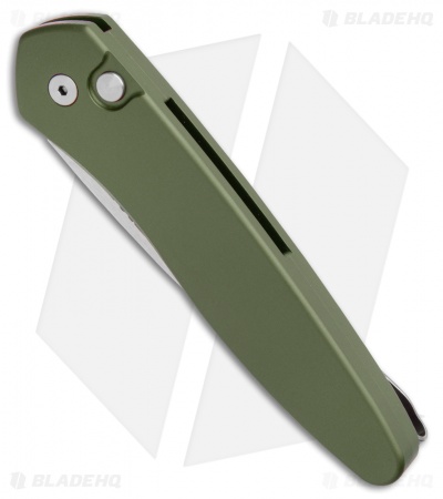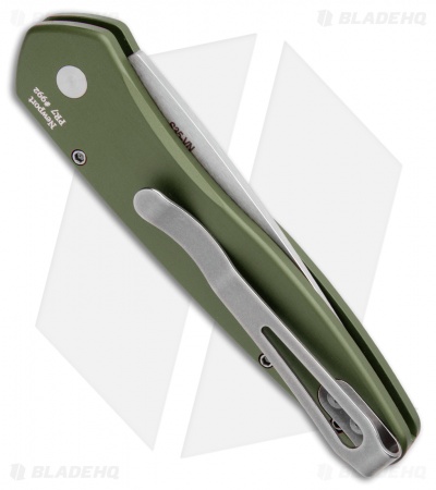 This Newport knife has a hand ground S35VN steel blade with a stonewash finish. The green anodized aluminum handle has satin hardware and a black tip-up carry pocket clip.