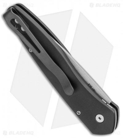This left hand Newport knife has a hand ground S35VN steel blade with a stonewash finish. The black anodized aluminum handle has satin hardware and a black tip-up carry pocket clip.