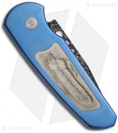 This is a one of a kind Runt 2 knife from Pro-Tech. It features a mirror polished titanium frame with pre-ban ivory inlays and scrimshaw done by Darrell Morris. Beautiful mosaic pin push button. The blade is Robert Eggerling mosaic high carbon Damascus.