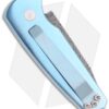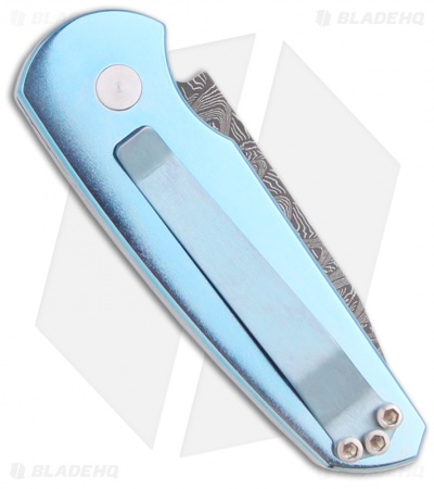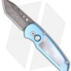 This custom Runt 3 has a blue anodized mirror polished titanium frame with a pearl inlay. The tanto blade is premium Chad Nichols Damascus. Matching blue anodized titanium pocket clip for tip-down carry. The firing button also has a pearl button to match the inlay. This knife comes in a black gift box. While the Runt’s size is small, it feels very good in the hand and has superb action and locks up solid. That’s what you expect and get from Pro-Tech Knives.