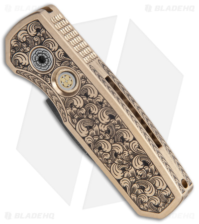 This custom Runt 5 is from Blade Show East 2022! It features a Spirograph Damascus Wharncliffe blade and Bruce Shaw hand-engraved bronze aluminum handle.