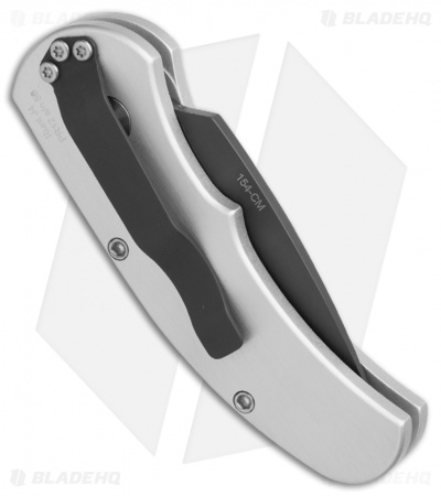 This Runt J4 model has a silver anodized aluminum handle and a black coated blade with a plain edge.