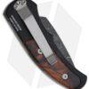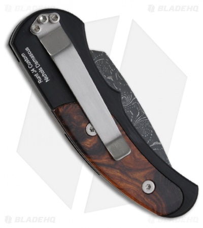 This J4 Runt Damascus Custom features a black aluminum handle with presentation grade Desert Ironwood inlays and a mosaic push button. The blade is stainless Chad Nichols Damascus steel with a plain edge. The 1 7/8″ blade is California legal. Despite the Runt’s small size it feels very good in the hand, it feels much bigger than it is. It opens like a rocket and lockup is solid. The J4 Runt also has a custom polished steel pocket clip for tip-down carry.