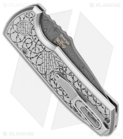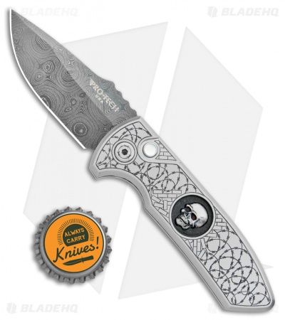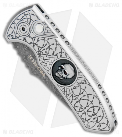 Pro-Tech SBR Steel Custom Automatic Knife Shaw Skull/Barbed Wire (2.6″ Damascus)