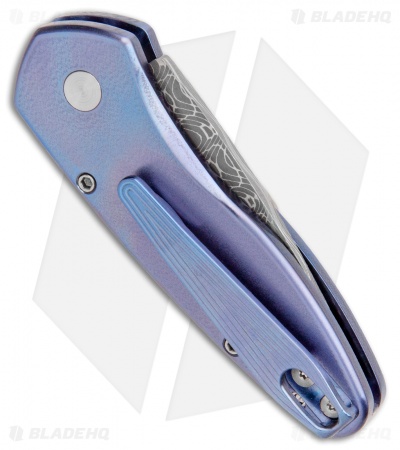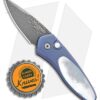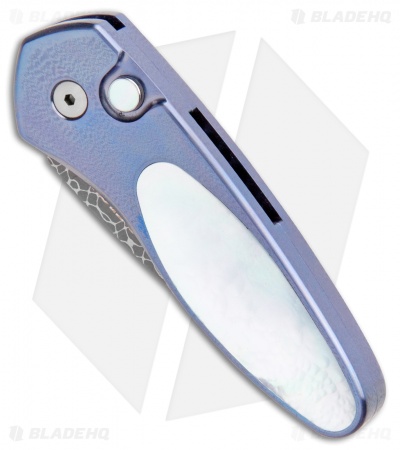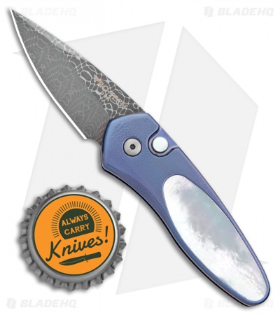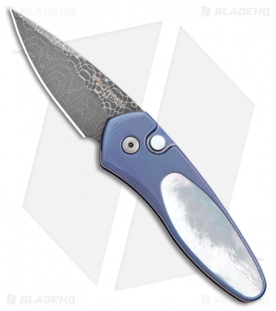 This Sprint Custom is a limited edition automatic knife with a beautiful mother of pearl inlay and matching push button insert. The blade is Damascus steel and the handle is blue anodized titanium. Includes a tip-up deep carry titanium pocket clip.