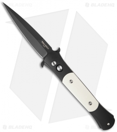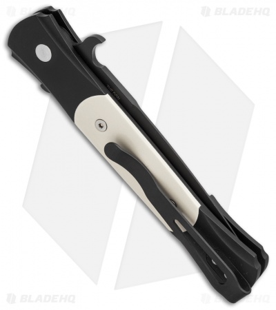 This Tuxedo style Don knife features a black finished blade and a black anodized aluminum handle with ivory Micarta inlays. The firing button and hardware are satin finished. Includes a black coated pocket clip.