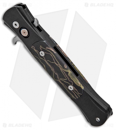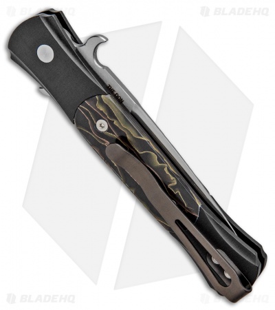 This Custom Don features a satin finished 154CM stainless steel blade. The handle is made from black anodized aluminum with custom Noble (polymer with reclaimed brass and copper) inlays and a mosaic pin push button. The hardware on this knife is all satin finished.