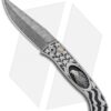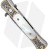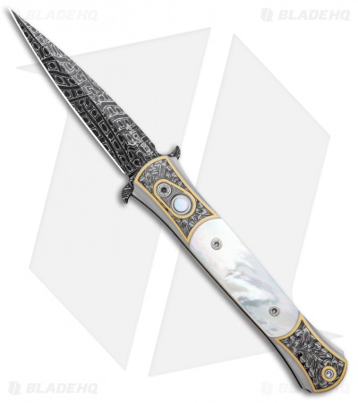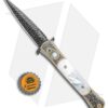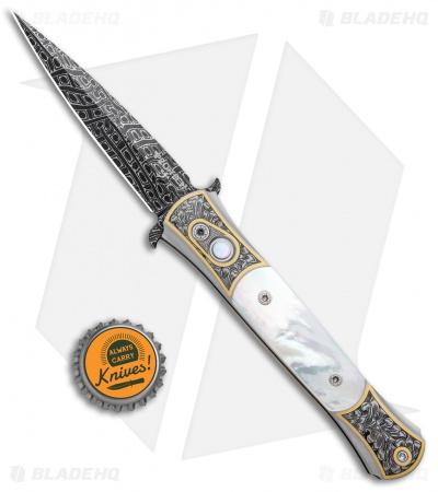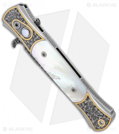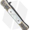 This Ultimate Custom Don is a rare find and well-appointed. It features presentation grade mother of pearl inlays and firing button insert. The hand satin finished 416 stainless steel frame is expertly hand engraved by Bruce Shaw. The push button deploys the mosaic pattern carbon Damascus blade, hand forged by Chad Nichols. Pictures here are of the actual knife for sale.