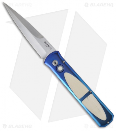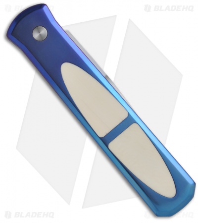 The Godfather is Pro-Tech’s flagship knife and every now and then they create new innovative embellishments on an already stylish piece. Such is the case with this Godfather knife which features a blue finished titanium frame with pre-ban Ivory inlays front/back and inset on the firing button as well. The 154-CM stainless steel blade has a Brend family hand satin finish.