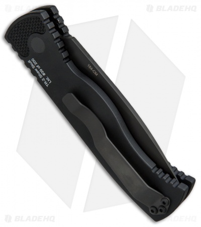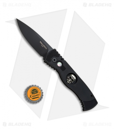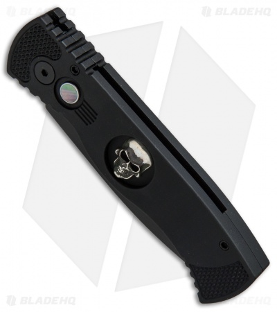 This limited edition run TR-2 knife features a mother of pearl push button and a Bruce Shaw designed sterling silver skull set into the black anodized aluminum handle. The stainless steel blade is black finished. This knife, like all Pro-Tech knives, fires hard and feels great in hand. These knives are serial numbered on the handle, only 200 made!