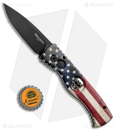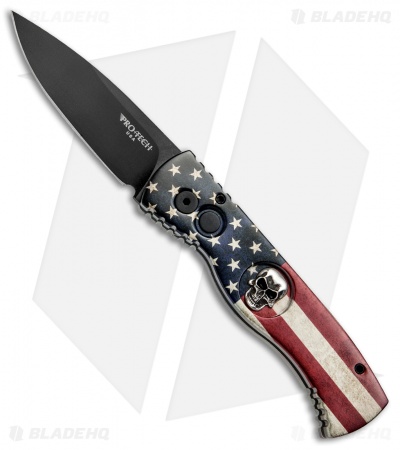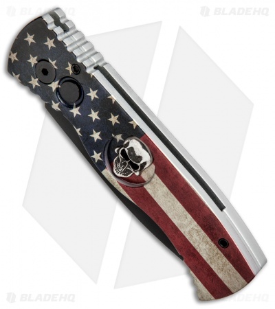 The Tactical Response 2.4 features a black finished 154-CM spear point blade with a plain edge and an anodized 6061-T6 aluminum body with a US flag finish and a Bruce Shaw designed sterling silver skull.