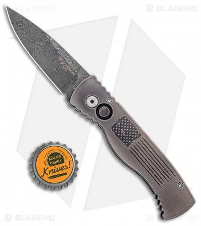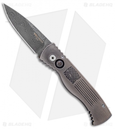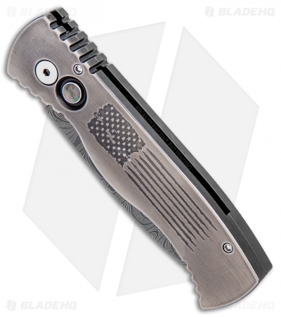 This Limited Edition Tactical Response 2 knife features a solid 416 stainless steel frame with a stylized American flag engraving. It’s outfitted with a beautiful pearl firing button and a tip-up carry pocket clip.