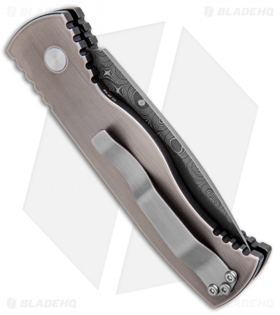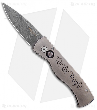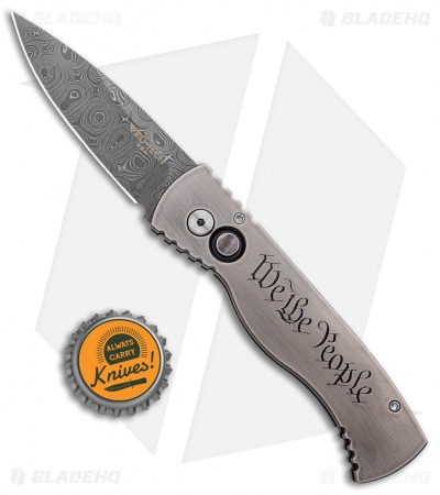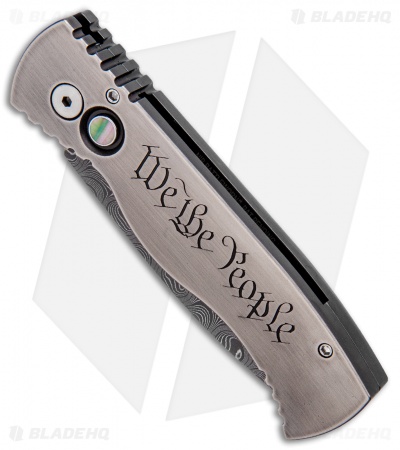 This Limited Edition Tactical Response 2 knife features a solid 416 stainless steel frame with a two-tone finish and “We the People” engraving, a beautiful pearl firing button and a satin finished titanium pocket clip. The blade is Damascus steel. Limited run of just ten pieces!