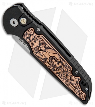 The TR-3 Auto is an awesome offering from Pro-Tech Knives. It features a 6061-T6 aluminum handle with a black finish and a copper inlay. The 154-CM steel blade is mirror finished with a compound grind edge. Black coated pocket clip and hardware finish off the design.